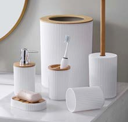 Transforme seu banheiro em um ambiente elegante e acolhedor com este kit de 6 peças. Feito em plástico resistente e acabamento sofisticado em bambu, ele é a escolha perfeita para quem busca beleza e organização no dia a dia.