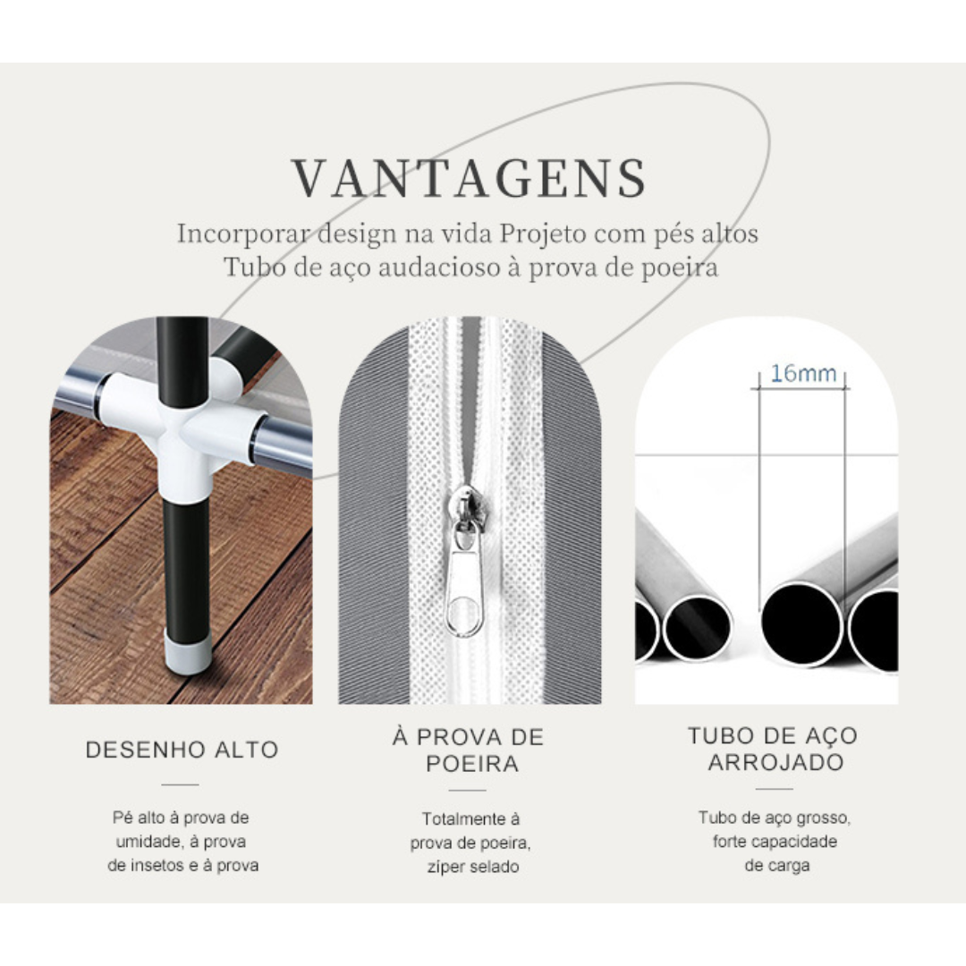 Possui cortinas com zíper que protegem as roupas de poeira, mantendo tudo limpo e organizado.